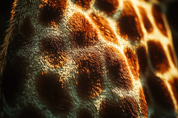 Close up of a giraffe's skin with a lot of detail. The giraffe's skin is covered in spots and has a unique pattern. The image has a warm, golden tone that gives it a sense of depth and texture