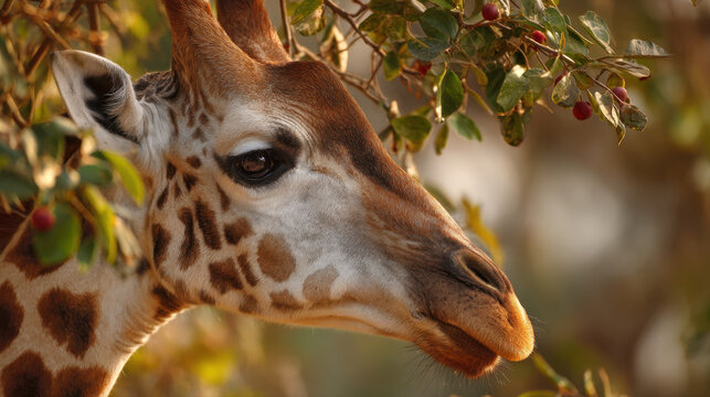 Giraffe head close-up surrounded by leafy branches in a natural setting with soft sunlight illuminating its unique patterns and features creating a serene atmosphere.