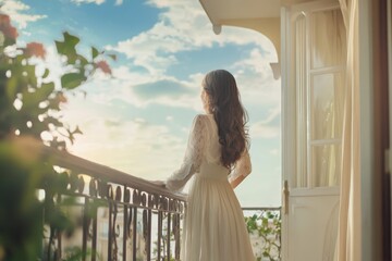 Young girl stands on balcony overlooking the beautiful landscape during a sunny afternoon, Young attractive girl standing on the open balcony, slow motion