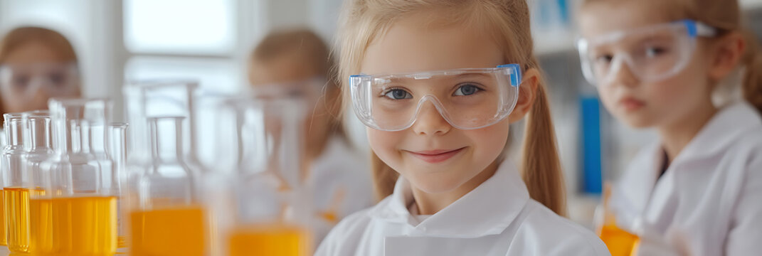 Young girls in a bright lab wearing safety glasses, engaging in science activities with orange liquids in beakers. Children exploring science with curiosity.