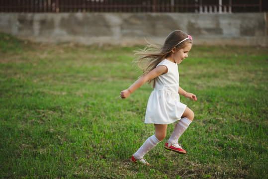 Running girls chasing soap bubbles in sunlit backyard garden during golden hour