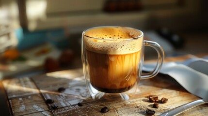 Close-up of a double-walled glass mug filled with a frothy coffee beverage, possibly a cappuccino or latte, given the thick layer of foam on top