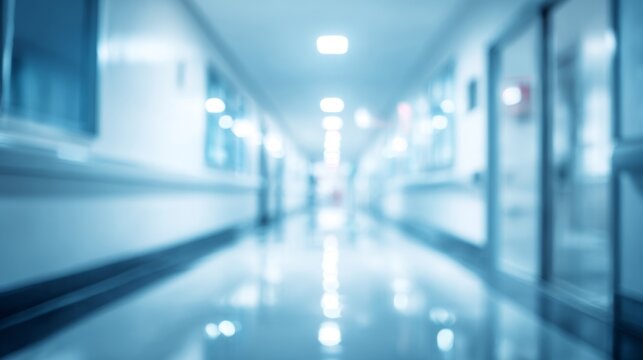 an indoor hallway within what appears to be a medical facility, given the presence of a hospital bed and other equipment in the background