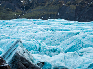 Jokulsarlon glacial lagoon in Iceland, with luminous blue icebergs from retreating glacier drifting towars the Atlantic Ocean.