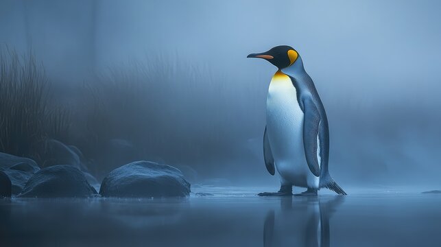 King penguin traveling across a glacial plain, fog rolling in from the distance, cold tones dominating the frame