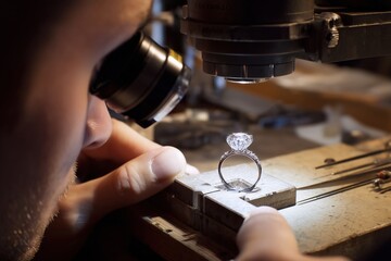 A jeweler examines a sparkling engagement ring with a magnifying glass for quality