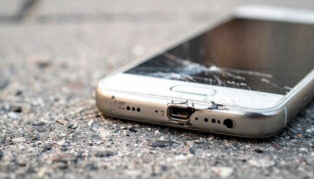 close up of broken smartphone with cracked screen and damaged charging port lying on concrete pavement