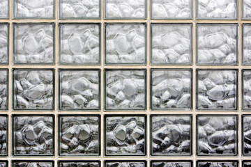 Green glass blocks background, texture of square bathroom wall tiles with reflection and light effect. Glass block mosaic for interior decoration in home or office space.