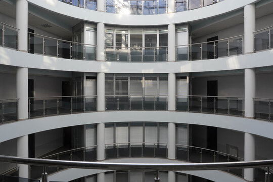 Photo in a building of several gray floors with glass balconies and white columns