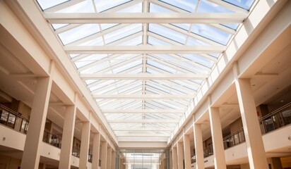 Bright architectural design with glass ceiling in modern building showcases open space and natural light