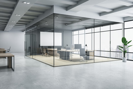 Luxury glass office interior with window and city view, furniture and equipment. Workplace concept. 3D Rendering.