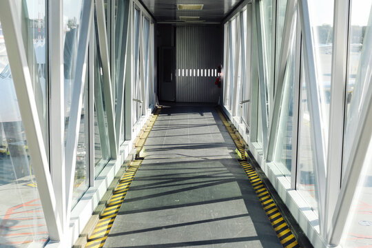 Empty passenger boarding bridge at airport terminal. Jetway tunnel leading to airplane entrance. Modern glass construction steel structure. Travel connection between terminal building and aircraft.