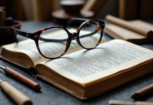 Reading glasses resting on an open book with a blurred background and warm lighting