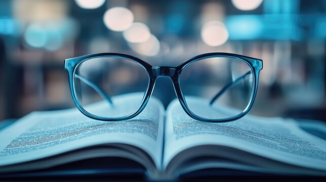 Eyeglasses rest atop an open book set against a blurred background of lights and bookshelves