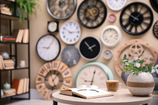 Open book, glasses, coffee and blurred view of wall with clocks on background