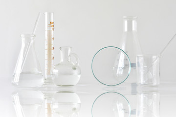Laboratory Glassware with Test Tubes – Medical Office Background. Laboratory copy space for illustrating diagnostics, research, lab testing, or pharmaceutical themes.
