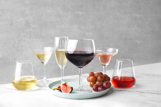 Various types of wine in different sort of glassware standing on a marble table surface