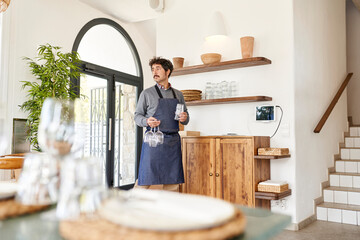 Restaurant owner with glassware in hall