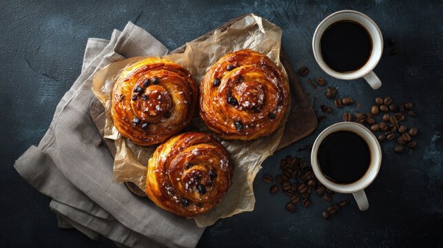 Flat lay of freshly baked Danish pastries glazed and golden with coffee beans and a linen napkin