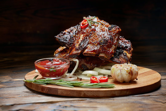 Grilled barbecue pork ribs with spices and herbs on wooden board