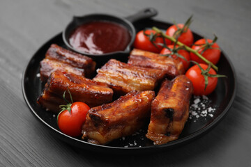 Tasty roasted pork ribs served with sauce and tomatoes on grey wooden table, closeup