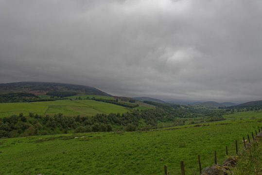 Looking down Glen Prosen Valley, high up in the Angus Glens of Scotland on a wet moody and atmospheric Morning. Glen Prosen, Angus, Scotland
