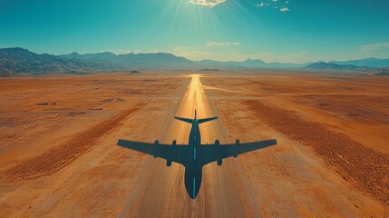 An airplane glides over a desert, casting a shadow on the sunlit runway with distant mountains beyond