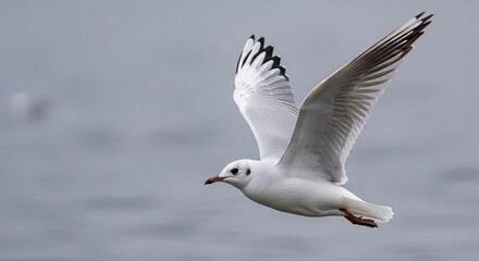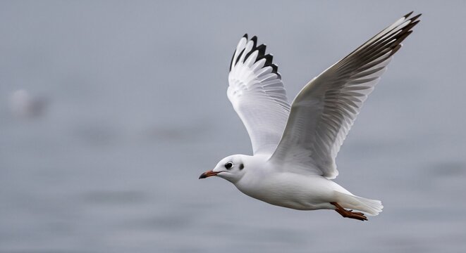 A serene capture of a graceful white bird gliding effortlessly across a calm, mirror-like body of water, under a soft and ethereal morning light.