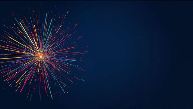 Vibrant neon burst on deep navy gradient with radiating rays, particles and copy space