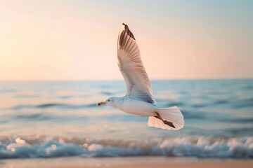 Seagull gliding low over quiet sea with pastel sky reflections for coastal themes