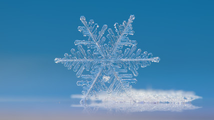 Snowflake on smooth gradient background: macro photo of real snow crystal on glass surface with LED back light. This is large snowflake of stellar dendrite / splitted plate type.