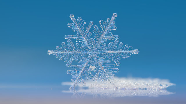 Snowflake on bright blue-brown gradient background. This is macro photo of real snow crystal with short arms and relief surface.