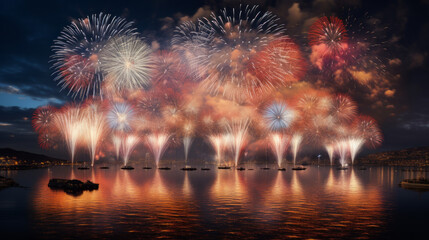 Vibrant fireworks in various colors adorn the night sky, suitable for the New Year and other celebrations