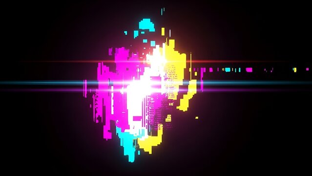 Futuristic glitch art with neon colors. Abstract digital distortion effect for tech concepts, web design. Perfect for rave parties, 80s and 90s aesthetic, gaming and computer themes.