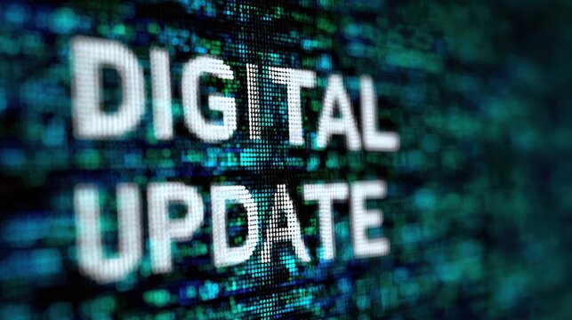 The Digital Update Text on a Pixelated Blue Green LED Screen Showing Technology Concept