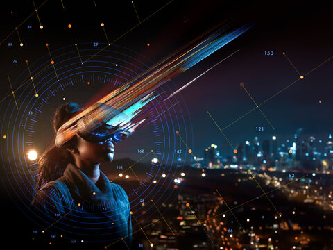 Futuristic woman wearing VR headset. Glitch pixel sorting effect and graphic overlays added to AI generated image.