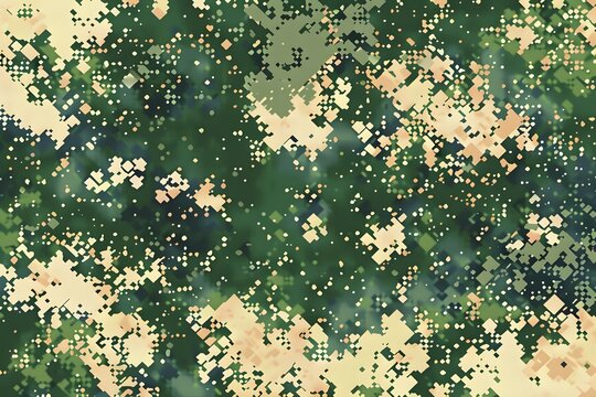 An army camouflage pattern with a pixelated, glitchy look. The background is green and beige, with small white flowers scattered across it in an intricate design. There is no text or other elements on