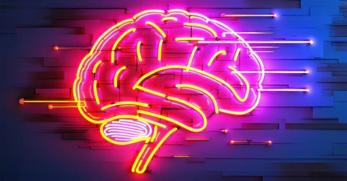 Neon sign cybernetic consciousness robotic brain forming glitchy digital patterns bright colorful realistic photo