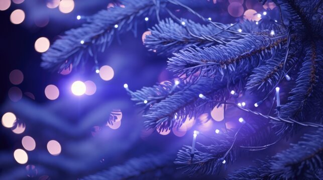 Purple ornaments on Christmas tree dark moody background. Merry Christmas Eve, Happy New Year concept. Lilac violet Baubles decorations wallpaper. Copy space..