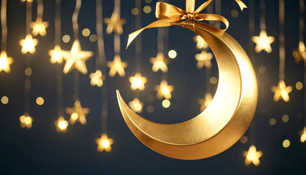 A radiant golden Eid crescent moon gracefully suspended by a silk ribbon, casting a gentle glow amidst a cascade of shimmering, luminous stars