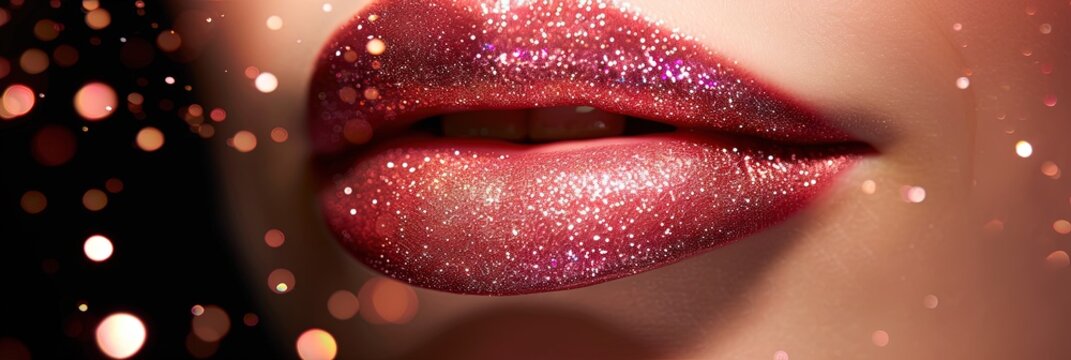glittering lipstick on closeup of woman's lips with bokeh background for beauty concept