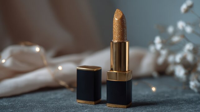Elegant red lipstick in a golden case surrounded by a sparkling glittery background and warm lighting effects