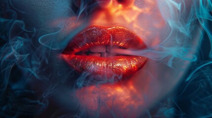 Close-up of red glittery lips exhaling blue smoke