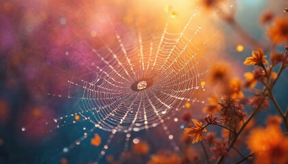Spider web with dew drops glistens on blurry background. Water beads sparkle on fine silk threads among orange flowers. Nature captures morning light and vibrant colors.