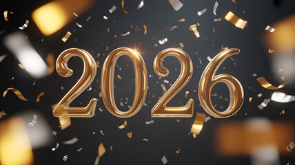 Golden 2026 Typography with Sparkling Confetti, Luxury Celebration Theme, Warm Golden Glow, Elegant Holiday Design, Shiny Metallic Numbers and Festive Decorative Elements for New Year Backgrounds