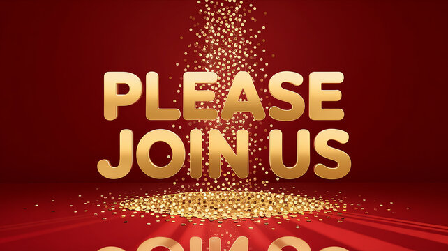 Gold 3D letters Please Join Us with falling gold glitter on red invitation celebration