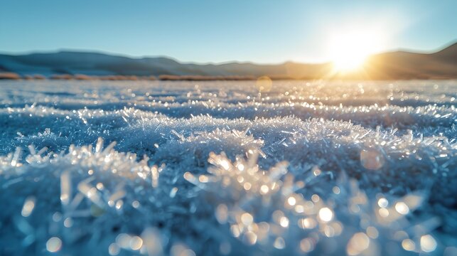 Glittering snow crystal texture with soft bokeh and frosty winter sunlight