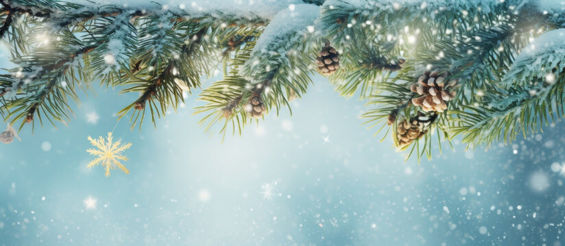 Frosty pine branch glistening in the winter sunlight creating a serene and peaceful seasonal scene