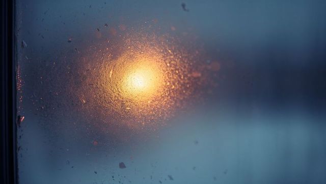 Dewy window at dusk with amber bokeh glow, condensation droplets and frosted texture