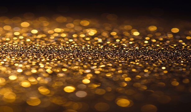 Golden glitter sparkles on a blue surface with a blurred bokeh background of warm, glowing lights creating a festive and luxurious atmosphere